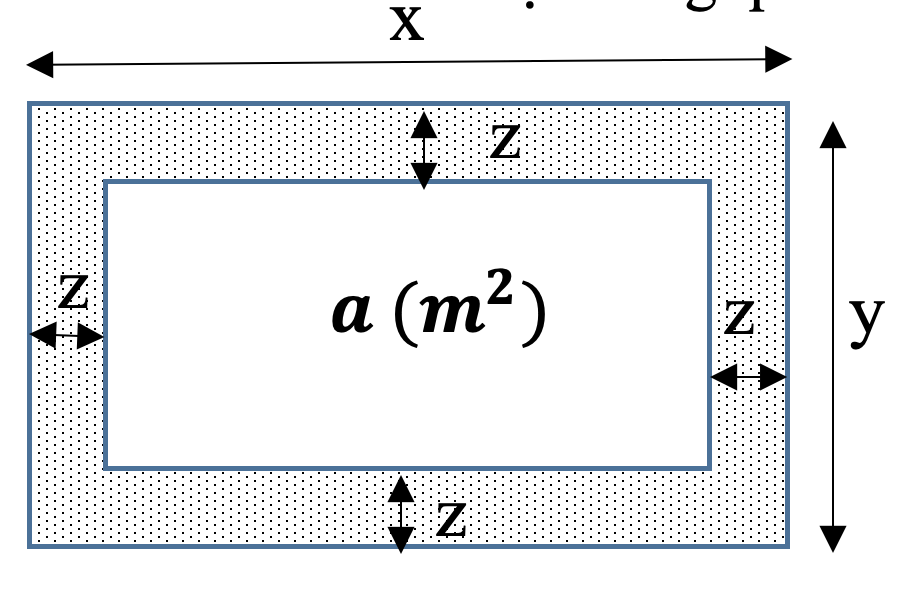 Bình đã xem mô hình công viên trước đó và biết được vườn trồng hoa có diện tích là a (~m^2~). Bình đố các bạn tìm độ rộng z lớn nhất của lối đi quanh khu công viên.